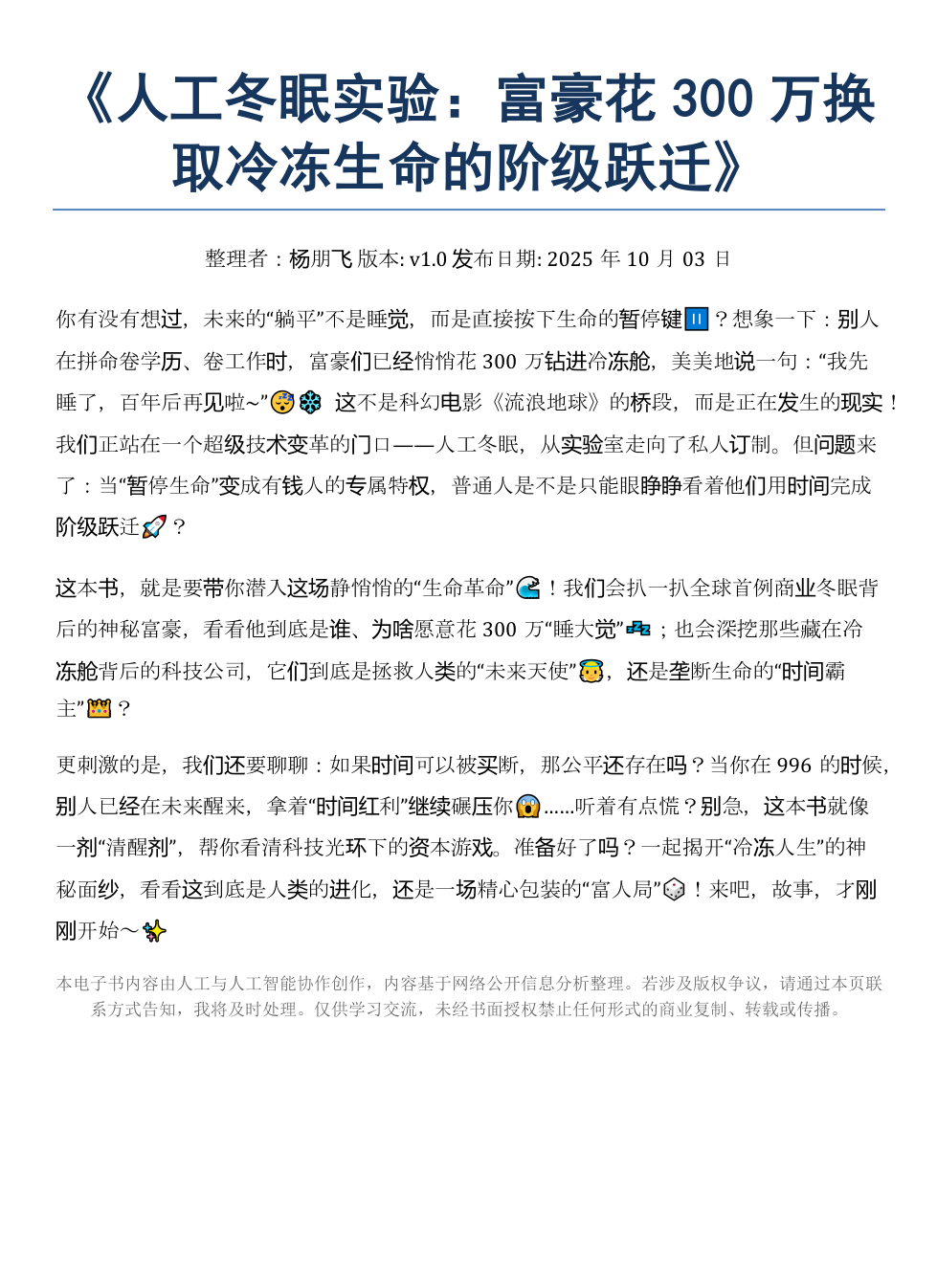 《人工冬眠实验:富豪花300万换取冷冻生命阶级跃迁》AI智慧电子书