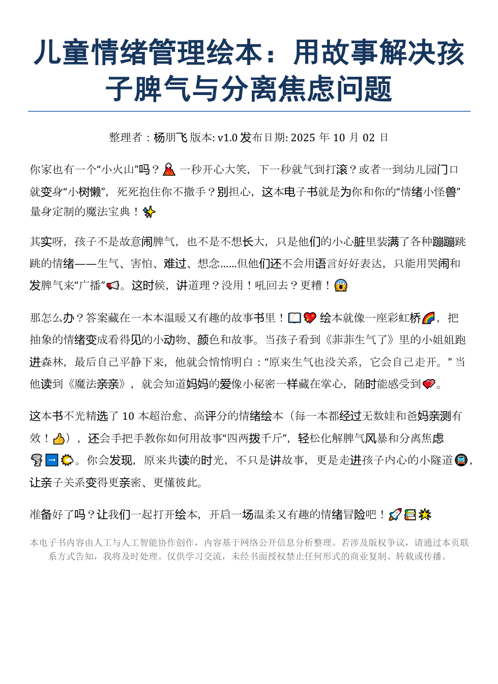 你家也有一个“小火山”吗?🌋 一秒开心大笑,下一秒就气到打滚?或者一到幼儿园门口就变身“小树懒”,死死抱住你不撒手?别担心,这本电子书就是为你和你的“情绪小怪兽”量身定制的魔法宝典!✨其实呀,孩子不是故意闹脾气,也不是不想长大,只是他们的小心脏里装满了各种蹦蹦跳跳的情绪——生气、害怕、难过、想念……但他们还不会用语言好好表达,只能用哭闹和发脾气来“广播”📢。这时候,讲道理?没用!吼回去?更糟!😱那怎么办?答案藏在一本本温暖又有趣的故事书里!📖💖 绘本就像一座彩虹桥🌈,把抽象的情绪变成看得见的小动物、颜色和故事。当孩子看到《菲菲生气了》里的小姐姐跑进森林,最后自己平静下来,他就会悄悄明白:“原来生气也没关系,它会自己走开。” 当他读到《魔法亲亲》,就会知道妈妈的爱像小秘密一样藏在掌心,随时能感受到💕。这本书不光精选了10本超治愈、高评分的情绪绘本(每一本都经过无数娃和爸妈亲测有效!👍),还会手把手教你如何用故事“四两拨千斤”,轻松化解脾气风暴和分离焦虑🌪️➡️🌤️。你会发现,原来共读的时光,不只是讲故事,更是走进孩子内心的小隧道🚇,让亲子关系变得更亲密、更懂彼此。准备好了吗?让我们一起打开绘本,开启一场温柔又有趣的情绪冒险吧!🚀📚🌟