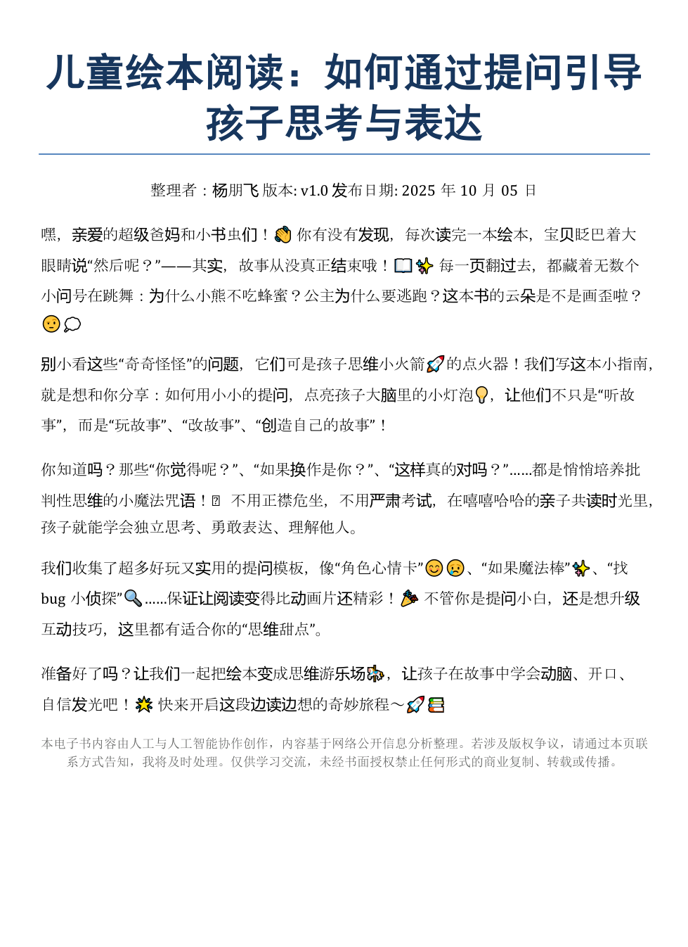 别小看这些“奇奇怪怪”的问题,它们可是孩子思维小火箭🚀的点火器!我们写这本小指南,就是想和你分享:如何用小小的提问,点亮孩子大脑里的小灯泡💡,让他们不只是“听故事”,而是“玩故事”、“改故事”、“创造自己的故事”!