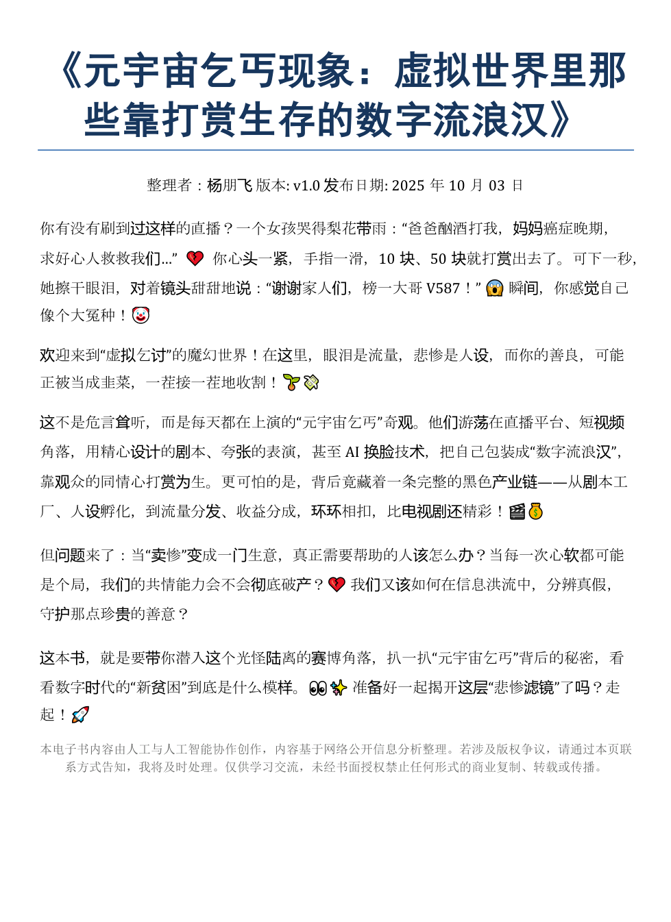 你有没有刷到过这样的直播?一个女孩哭得梨花带雨:“爸爸酗酒打我,妈妈癌症晚期,求好心人救救我们…” 💔 你心头一紧,手指一滑,10块、50块就打赏出去了。可下一秒,她擦干眼泪,对着镜头甜甜地说:“谢谢家人们,榜一大哥V587!” 😱 瞬间,你感觉自己像个大冤种!🤡欢迎来到“虚拟乞讨”的魔幻世界!在这里,眼泪是流量,悲惨是人设,而你的善良,可能正被当成韭菜,一茬接一茬地收割!🌱💸这不是危言耸听,而是每天都在上演的“元宇宙乞丐”奇观。他们游荡在直播平台、短视频角落,用精心设计的剧本、夸张的表演,甚至AI换脸技术,把自己包装成“数字流浪汉”,靠观众的同情心打赏为生。更可怕的是,背后竟藏着一条完整的黑色产业链——从剧本工厂、人设孵化,到流量分发、收益分成,环环相扣,比电视剧还精彩!🎬💰但问题来了:当“卖惨”变成一门生意,真正需要帮助的人该怎么办?当每一次心软都可能是个局,我们的共情能力会不会彻底破产?💔 我们又该如何在信息洪流中,分辨真假,守护那点珍贵的善意?这本书,就是要带你潜入这个光怪陆离的赛博角落,扒一扒“元宇宙乞丐”背后的秘密,看看数字时代的“新贫困”到底是什么模样。👀✨ 准备好一起揭开这层“悲惨滤镜”了吗?走起!🚀