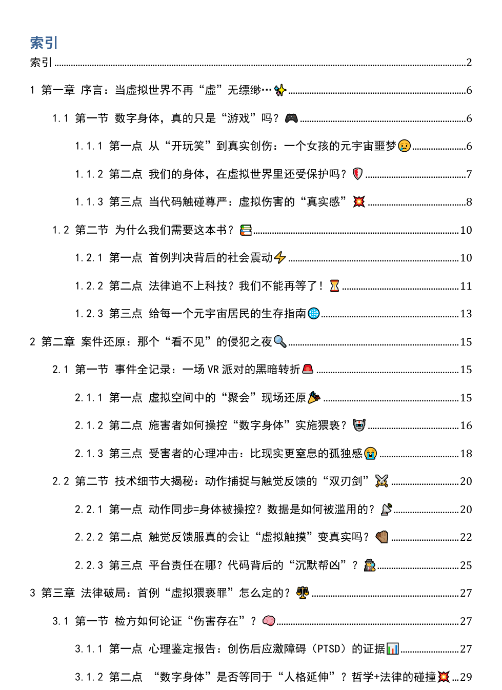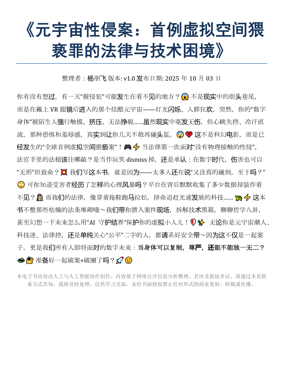 你有没有想过,有一天“被侵犯”可能发生在看不见的地方?😱 不是现实中的街头巷尾,而是在戴上VR眼镜后进入的那个炫酷元宇宙——灯光闪烁、人群狂欢,突然,你的“数字身体”被陌生人强行触摸、挤压、无法挣脱……虽然现实中毫发无伤,但心跳失控、冷汗直流,那种恐惧和羞辱感,真实到让你几天不敢再碰头盔。😨💔 这不是科幻电影,而是已经发生的“全球首例虚拟空间猥亵案”!🎮⚡ 当法律第一次面对“没有物理接触的性侵”,法官手里的法槌该往哪敲?是当作玩笑 dismiss 掉,还是承认:在数字时代,伤害也可以“无形”但致命?💥 我们写这本书,就是因为——太多人还在说“又没真的碰到,至于吗?” 🙄 可你知道受害者经历了怎样的心理风暴吗?平台在背后默默收集了多少数据却装作看不见?🕵️♀️ 而我们的法律,像穿着拖鞋跑马拉松,拼命追赶光速发展的科技…… 🐢⚡ 这本书不整那些枯燥的法条堆砌哦~我们带你潜入案件现场,拆解技术黑箱,聊聊哲学八卦,甚至幻想一下未来怎么用“AI守护结界”保护你的虚拟小人儿!🛡️✨ 无论你是元宇宙潮人、科技迷、法律控,还是单纯关心“公平”二字的人,都请系好安全带~因为这不仅是一起案子,更是我们所有人即将面对的数字未来:当身体可以复制,尊严,还能不能独一无二? 💫🔐 准备好一起破案+破圈了吗?🚀😉
