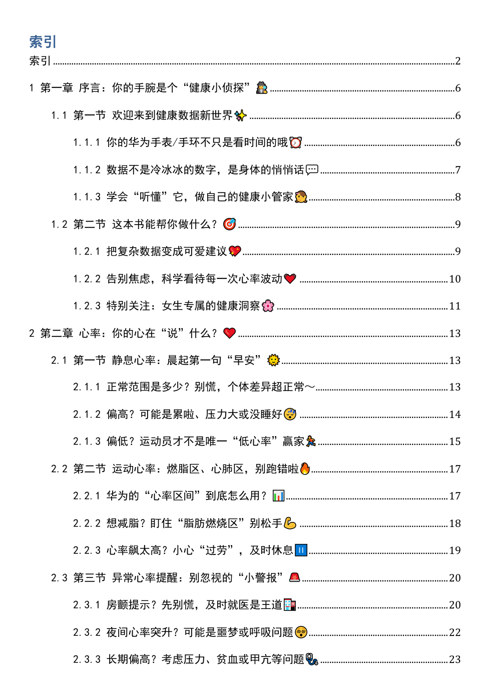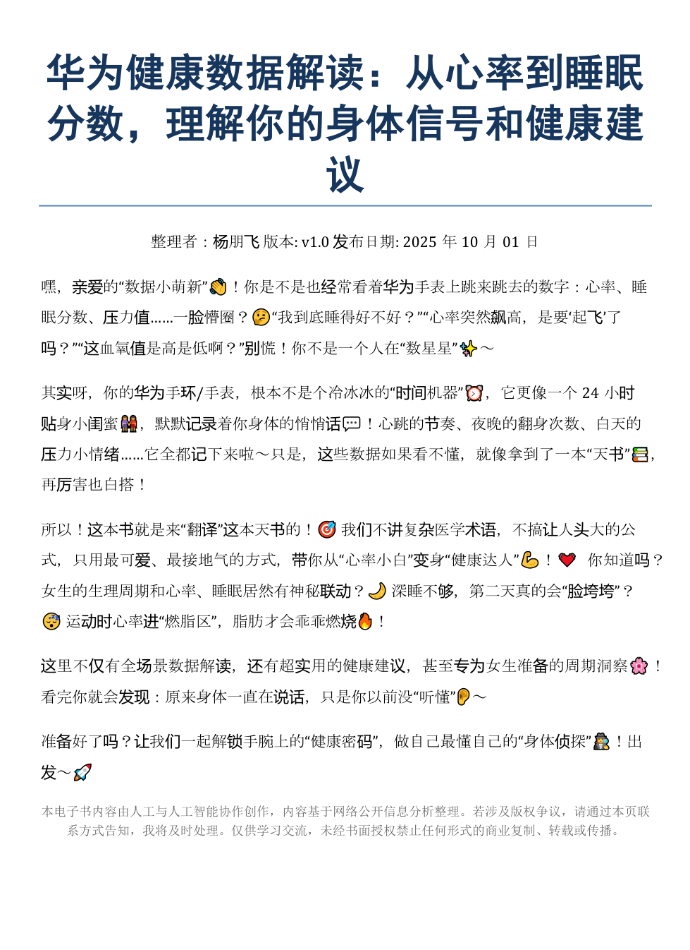 嘿,亲爱的“数据小萌新”👋!你是不是也经常看着华为手表上跳来跳去的数字:心率、睡眠分数、压力值……一脸懵圈?🤔“我到底睡得好不好?”“心率突然飙高,是要‘起飞’了吗?”“这血氧值是高是低啊?”别慌!你不是一个人在“数星星”✨~其实呀,你的华为手环/手表,根本不是个冷冰冰的“时间机器”⏰,它更像一个24小时贴身小闺蜜👭,默默记录着你身体的悄悄话💬!心跳的节奏、夜晚的翻身次数、白天的压力小情绪……它全都记下来啦~只是,这些数据如果看不懂,就像拿到了一本“天书”📚,再厉害也白搭!所以!这本书就是来“翻译”这本天书的!🎯 我们不讲复杂医学术语,不搞让人头大的公式,只用最可爱、最接地气的方式,带你从“心率小白”变身“健康达人”💪!💓 你知道吗?女生的生理周期和心率、睡眠居然有神秘联动?🌙 深睡不够,第二天真的会“脸垮垮”?😴 运动时心率进“燃脂区”,脂肪才会乖乖燃烧🔥!这里不仅有全场景数据解读,还有超实用的健康建议,甚至专为女生准备的周期洞察🌸!看完你就会发现:原来身体一直在说话,只是你以前没“听懂”👂~准备好了吗?让我们一起解锁手腕上的“健康密码”,做自己最懂自己的“身体侦探”🕵️♀️!出发~🚀
