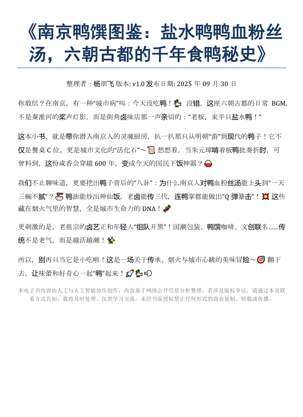 《南京鸭馔图鉴:盐水鸭鸭血粉丝汤,千年食鸭秘史》AI智慧电子书