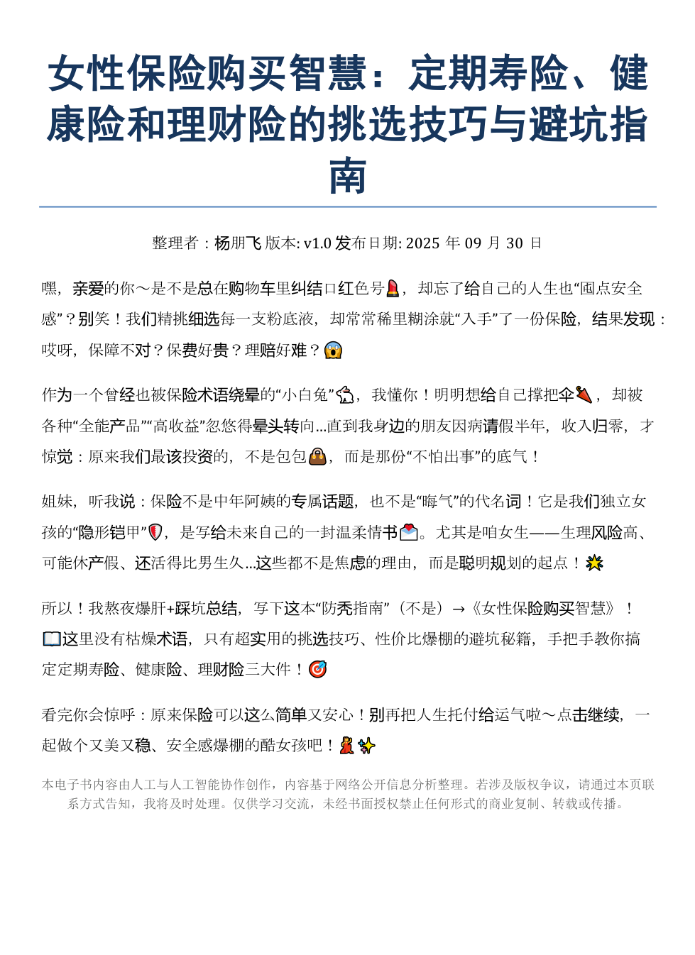 所以!我熬夜爆肝+踩坑总结,写下这本“防秃指南”(不是)→《女性保险购买智慧》!📖这里没有枯燥术语,只有超实用的挑选技巧、性价比爆棚的避坑秘籍,手把手教你搞定定期寿险、健康险、理财险三大件!🎯