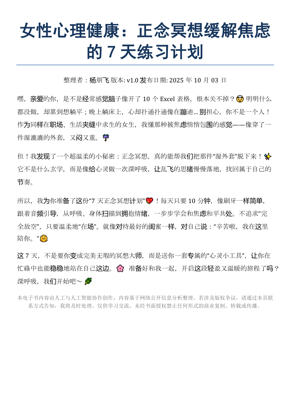 《女性心理健康:正念冥想缓解焦虑的7天练习计划》AI智慧电子书