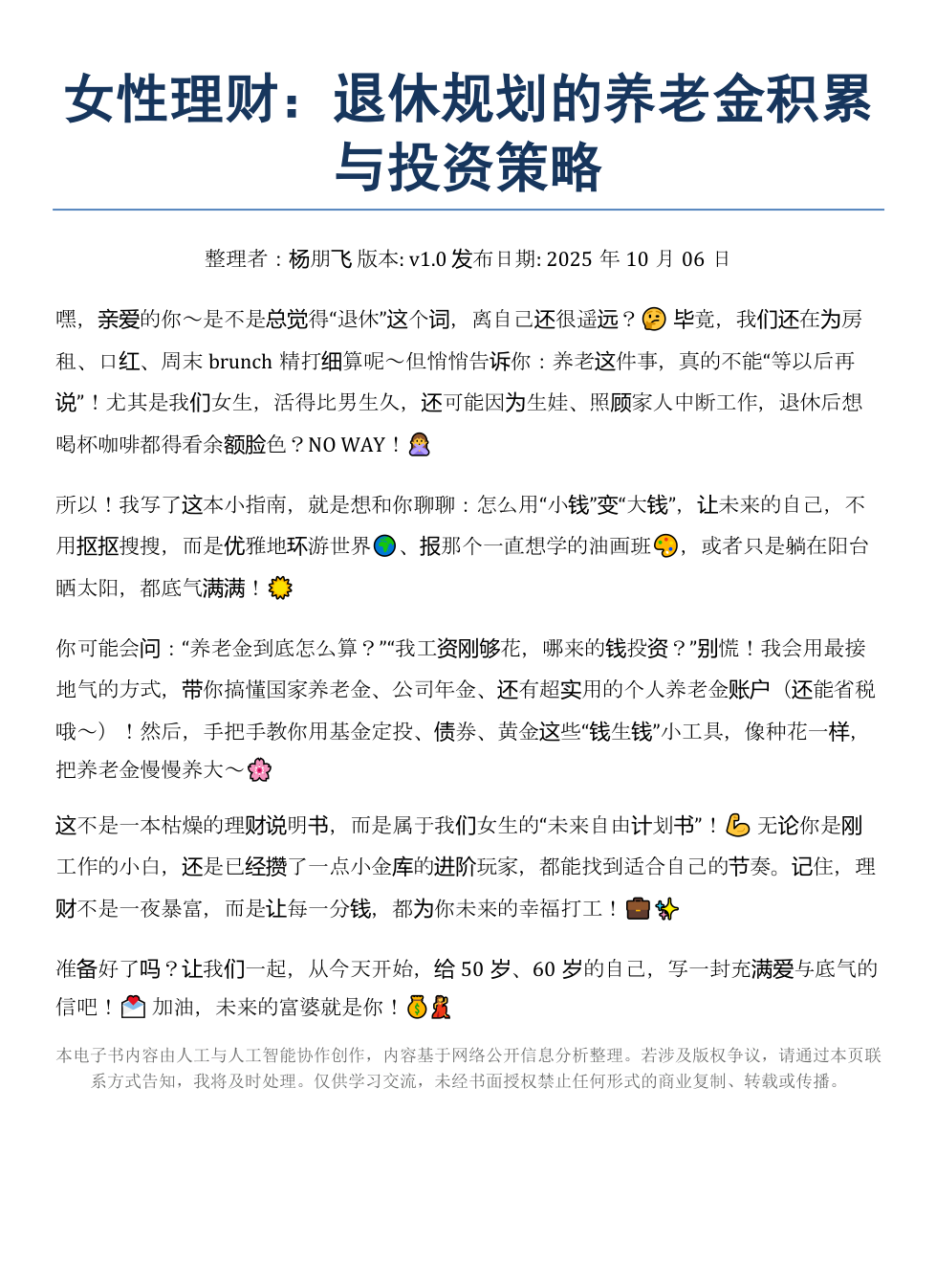 嘿,亲爱的你~是不是总觉得“退休”这个词,离自己还很遥远?🤔 毕竟,我们还在为房租、口红、周末brunch精打细算呢~但悄悄告诉你:养老这件事,真的不能“等以后再说”!尤其是我们女生,活得比男生久,还可能因为生娃、照顾家人中断工作,退休后想喝杯咖啡都得看余额脸色?NO WAY!🙅‍♀️所以!我写了这本小指南,就是想和你聊聊:怎么用“小钱”变“大钱”,让未来的自己,不用抠抠搜搜,而是优雅地环游世界🌍、报那个一直想学的油画班🎨,或者只是躺在阳台晒太阳,都底气满满!☀️你可能会问:“养老金到底怎么算?”“我工资刚够花,哪来的钱投资?”别慌!我会用最接地气的方式,带你搞懂国家养老金、公司年金、还有超实用的个人养老金账户(还能省税哦~)!然后,手把手教你用基金定投、债券、黄金这些“钱生钱”小工具,像种花一样,把养老金慢慢养大~🌸这不是一本枯燥的理财说明书,而是属于我们女生的“未来自由计划书”!💪 无论你是刚工作的小白,还是已经攒了一点小金库的进阶玩家,都能找到适合自己的节奏。记住,理财不是一夜暴富,而是让每一分钱,都为你未来的幸福打工!💼✨准备好了吗?让我们一起,从今天开始,给50岁、60岁的自己,写一封充满爱与底气的信吧!💌 加油,未来的富婆就是你!💰💃