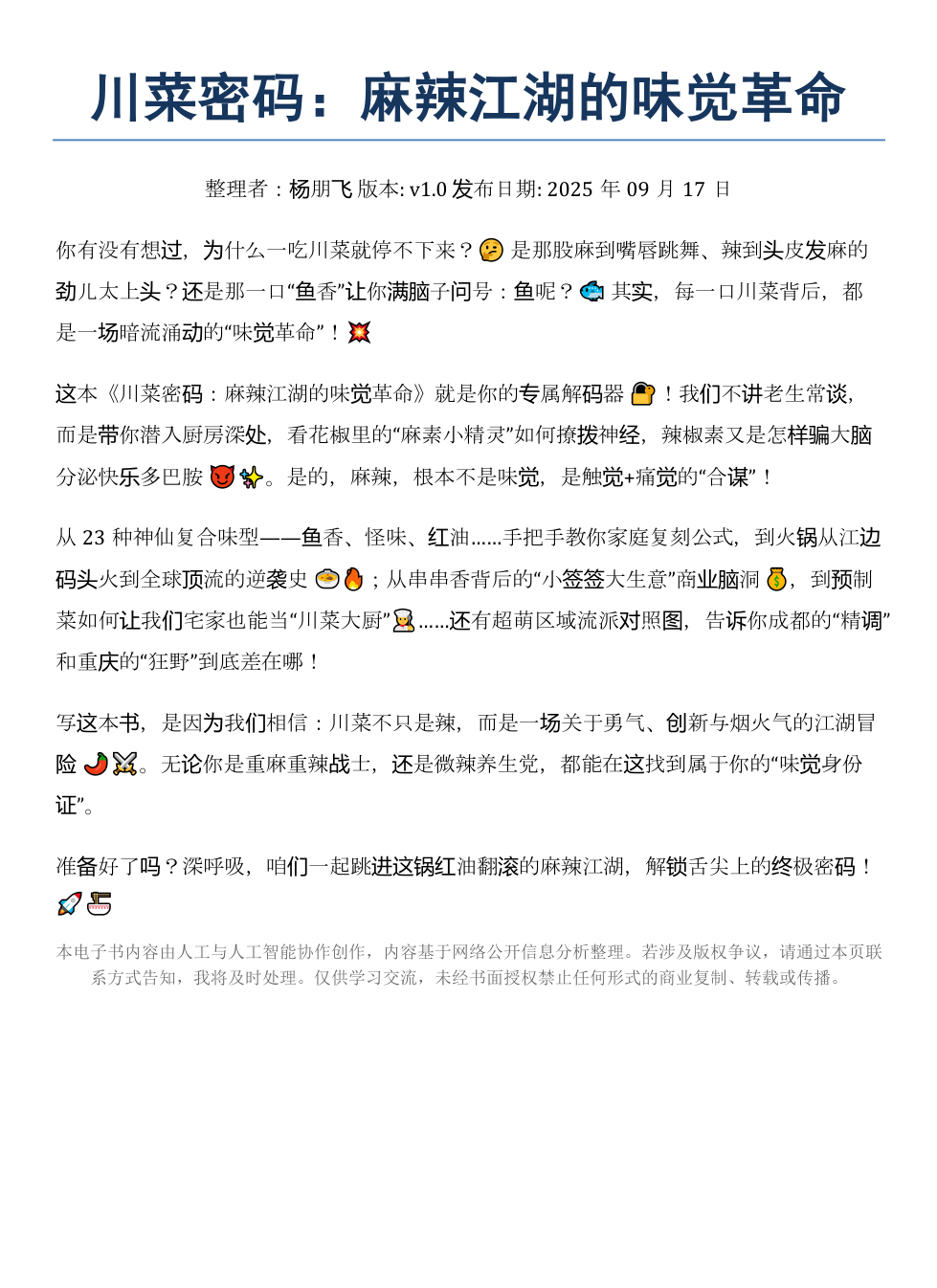 写这本书,是因为我们相信:川菜不只是辣,而是一场关于勇气、创新与烟火气的江湖冒险 🌶️⚔️。无论你是重麻重辣战士,还是微辣养生党,都能在这找到属于你的“味觉身份证”。