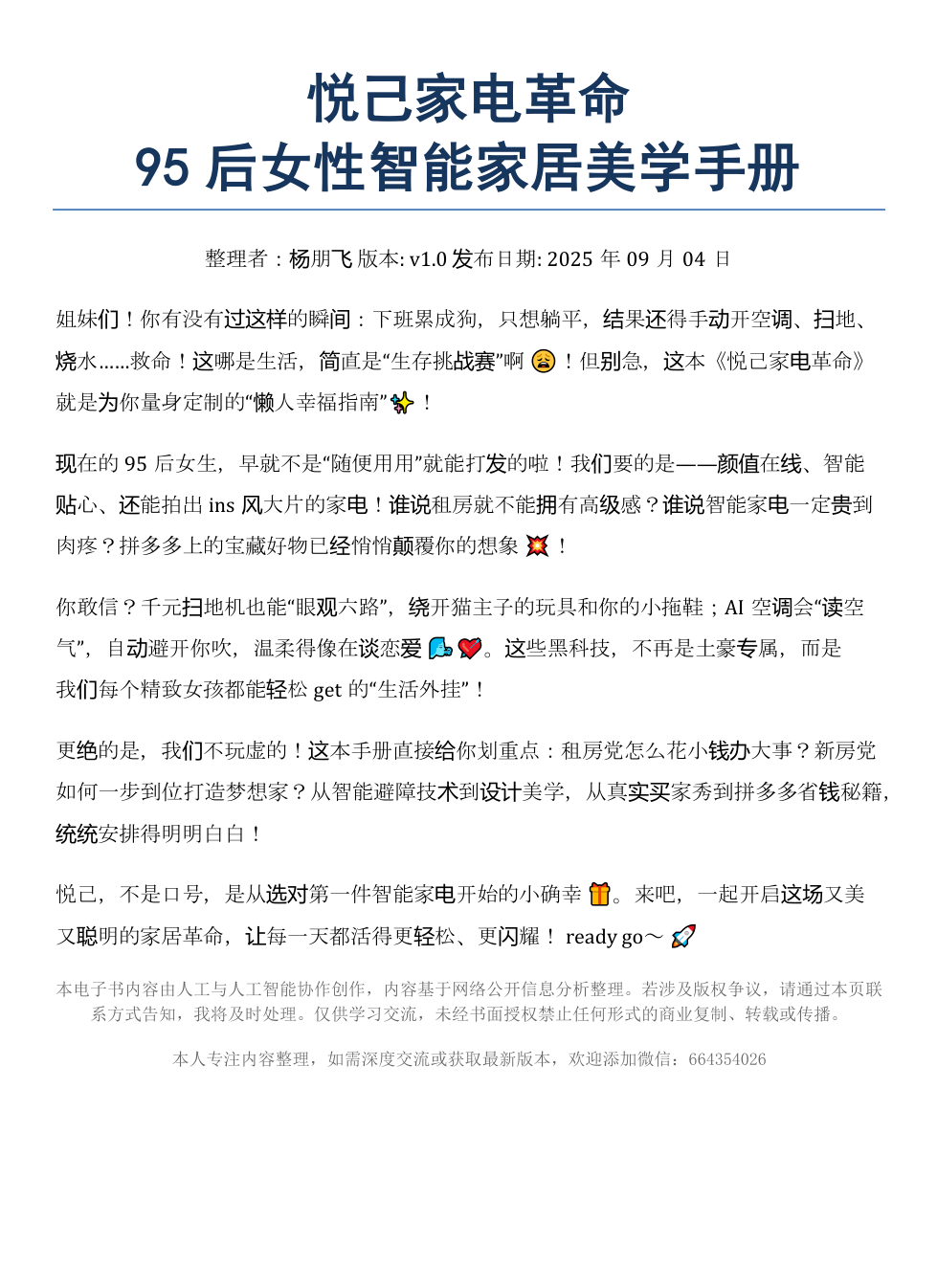 姐妹们!你有没有过这样的瞬间:下班累成狗,只想躺平,结果还得手动开空调、扫地、烧水……救命!这哪是生活,简直是“生存挑战赛”啊 😩!但别急,这本《悦己家电革命》就是为你量身定制的“懒人幸福指南”✨!