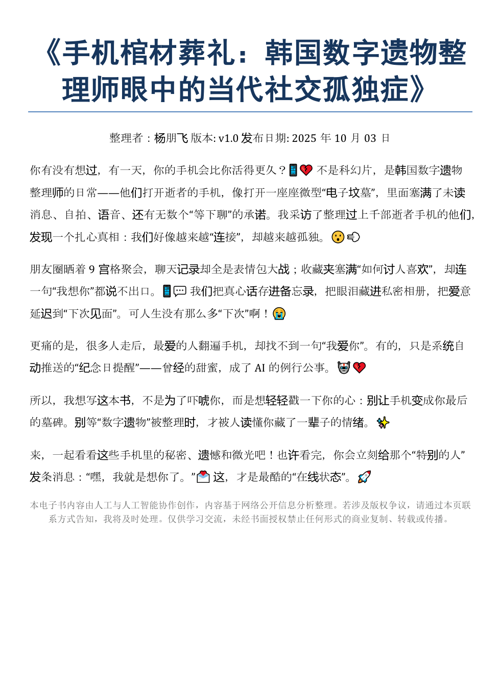 《手机棺材葬礼:韩国数字遗物整理师的社交孤独症》AI智慧电子书