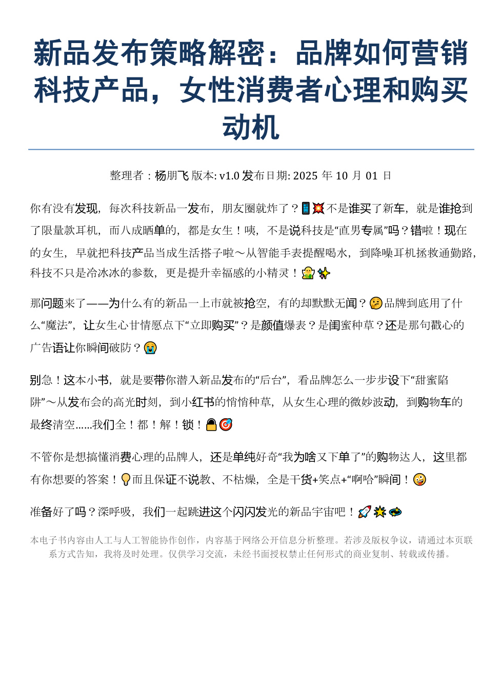 你有没有发现,每次科技新品一发布,朋友圈就炸了?📱💥不是谁买了新车,就是谁抢到了限量款耳机,而八成晒单的,都是女生!咦,不是说科技是“直男专属”吗?错啦!现在的女生,早就把科技产品当成生活搭子啦~从智能手表提醒喝水,到降噪耳机拯救通勤路,科技不只是冷冰冰的参数,更是提升幸福感的小精灵!🧚‍♀️✨那问题来了——为什么有的新品一上市就被抢空,有的却默默无闻?🤔品牌到底用了什么“魔法”,让女生心甘情愿点下“立即购买”?是颜值爆表?是闺蜜种草?还是那句戳心的广告语让你瞬间破防?😭别急!这本小书,就是要带你潜入新品发布的“后台”,看品牌怎么一步步设下“甜蜜陷阱”~从发布会的高光时刻,到小红书的悄悄种草,从女生心理的微妙波动,到购物车的最终清空……我们全!都!解!锁!🔓🎯不管你是想搞懂消费心理的品牌人,还是单纯好奇“我为啥又下单了”的购物达人,这里都有你想要的答案!💡而且保证不说教、不枯燥,全是干货+笑点+“啊哈”瞬间!🤪准备好了吗?深呼吸,我们一起跳进这个闪闪发光的新品宇宙吧!🚀🌟💫