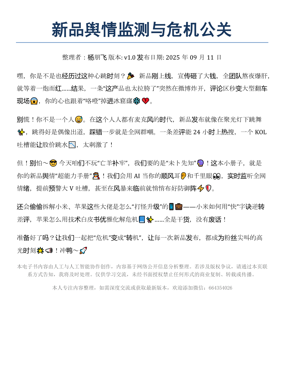 嘿,你是不是也经历过这种心跳时刻?🎉 新品刚上线,宣传砸了大钱,全团队熬夜爆肝,就等着一炮而红……结果,一条“这产品也太拉胯了”突然在微博炸开,评论区秒变大型翻车现场😱,你的心也跟着“咯噔”掉进冰窟窿❄️💔。别慌!你不是一个人😅。在这个人人都有麦克风的时代,新品发布就像在聚光灯下跳舞✨,跳得好是偶像出道,踩错一步就是全网群嘲。一条差评能24小时上热搜,一个KOL吐槽能让股价跳水📉,太刺激了!但!别怕~😎 今天咱们不玩“亡羊补牢”,我们要的是“未卜先知”🔮!这本小册子,就是你的新品舆情“超能力手册”🦸♀️!我们会用AI当你的顺风耳👂和千里眼👀,实时监听全网情绪,提前预警大V吐槽,甚至在风暴来临前就悄悄布好防御阵⚡🛡️。还会偷偷拆解小米、苹果这些大佬是怎么“打怪升级”的📱💼——小米如何用“快”字诀逆转差评,苹果怎么用技术白皮书优雅化解危机📘✨……全是干货,没有废话!准备好了吗?让我们一起把“危机”变成“转机”,让每一次新品发布,都成为粉丝尖叫的高光时刻🌟📣!冲鸭~🚀