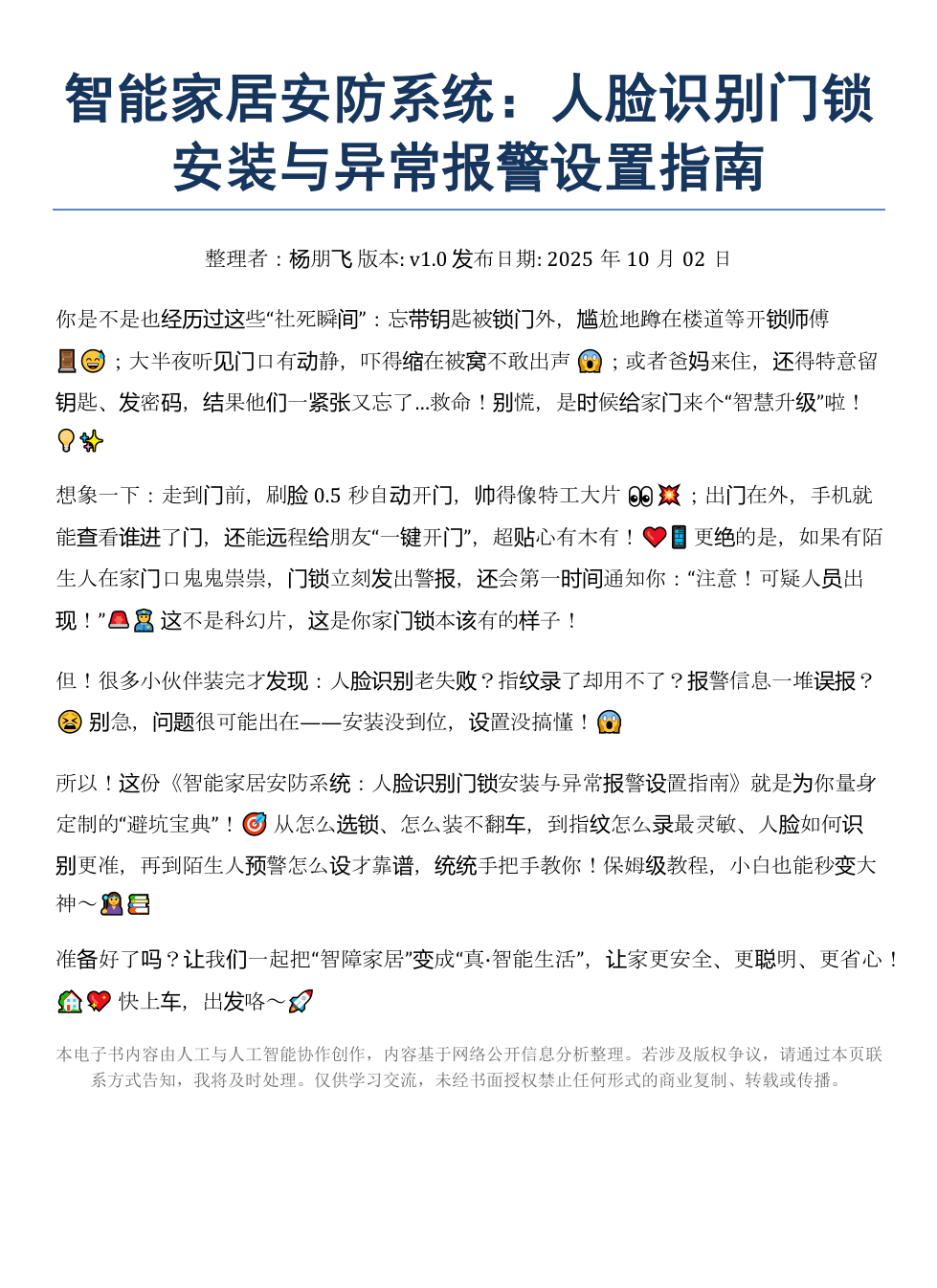 所以!这份《智能家居安防系统:人脸识别门锁安装与异常报警设置指南》就是为你量身定制的“避坑宝典”!🎯 从怎么选锁、怎么装不翻车,到指纹怎么录最灵敏、人脸如何识别更准,再到陌生人预警怎么设才靠谱,统统手把手教你!保姆级教程,小白也能秒变大神~🧙♀️📚