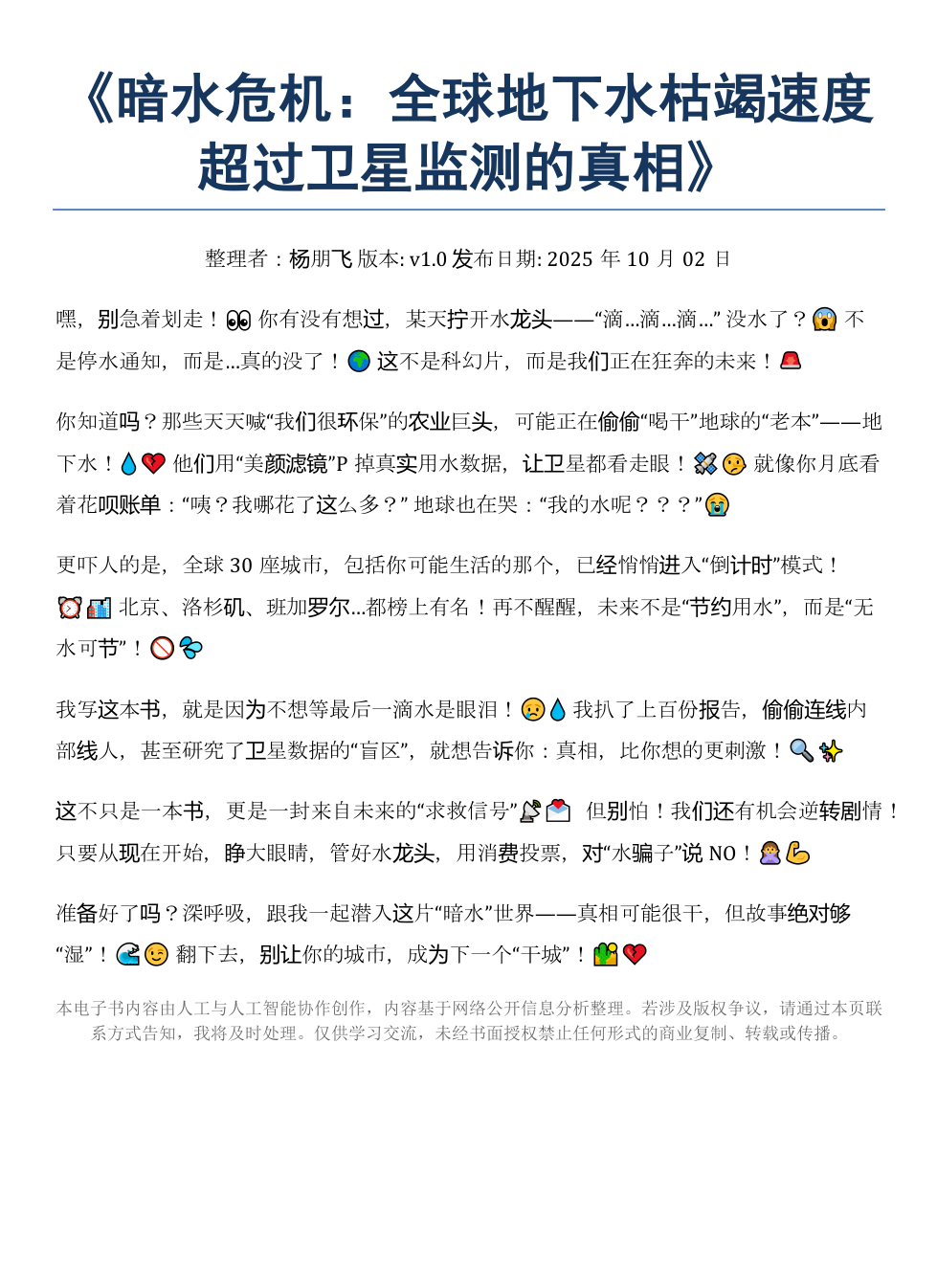 嘿,别急着划走!👀 你有没有想过,某天拧开水龙头——“滴…滴…滴…” 没水了?😱 不是停水通知,而是…真的没了!🌍 这不是科幻片,而是我们正在狂奔的未来!🚨你知道吗?那些天天喊“我们很环保”的农业巨头,可能正在偷偷“喝干”地球的“老本”——地下水!💧💔 他们用“美颜滤镜”P掉真实用水数据,让卫星都看走眼!🛰️🤥 就像你月底看着花呗账单:“咦?我哪花了这么多?” 地球也在哭:“我的水呢???”😭更吓人的是,全球30座城市,包括你可能生活的那个,已经悄悄进入“倒计时”模式!⏰🏙️ 北京、洛杉矶、班加罗尔…都榜上有名!再不醒醒,未来不是“节约用水”,而是“无水可节”!🚫💦我写这本书,就是因为不想等最后一滴水是眼泪!😢💧 我扒了上百份报告,偷偷连线内部线人,甚至研究了卫星数据的“盲区”,就想告诉你:真相,比你想的更刺激!🔍✨这不只是一本书,更是一封来自未来的“求救信号”📡💌 但别怕!我们还有机会逆转剧情!只要从现在开始,睁大眼睛,管好水龙头,用消费投票,对“水骗子”说NO!🙅♀️💪准备好了吗?深呼吸,跟我一起潜入这片“暗水”世界——真相可能很干,但故事绝对够“湿”!🌊😉 翻下去,别让你的城市,成为下一个“干城”!🏜️💔