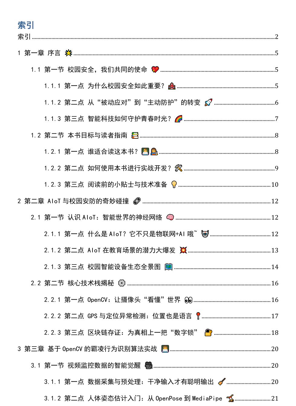 嘿,未来的校园守护者!👋 你有没有想过,每天上学放学的路上、课间十分钟的走廊里,其实藏着很多“看不见的小风暴”?🌪️ 霸凌、走失、突发意外……这些词听起来好沉重,但别担心,我们不是来贩卖焦虑的,而是来“搞事情”的!💥想象一下:摄像头不再只是“沉默的监视者”,而是能“看懂”打架、推搡的AI小卫士 👮♂️✨;学生的校牌会“悄悄”感知异常停留或越界,像GPS小保镖一样默默守护 🛰️🛡️;一旦按下SOS,求助信息立刻上链,时间、地点、证据统统“冻住”,谁也别想赖账!⛓️✅这就是我们想和你一起打造的——超酷校园安全防护智能系统!🚀 不是冷冰冰的代码堆砌,而是有温度、有反应、有担当的AIoT黑科技 combo!🎯 我们要用OpenCV让机器“会看”,用GPS让位置“会说话”,用区块链让真相“永存”!这本书,就是你的“超级英雄养成手册”🦸♀️📚,带你从0到1,把脑洞变成现实。无论你是技术宅、教育工作者,还是关心孩子安全的家长,都能在这里找到属于你的“安全代码” 💻❤️准备好了吗?让我们一起,用科技温柔地改变校园,让每个笑容都安心绽放!🌼😊