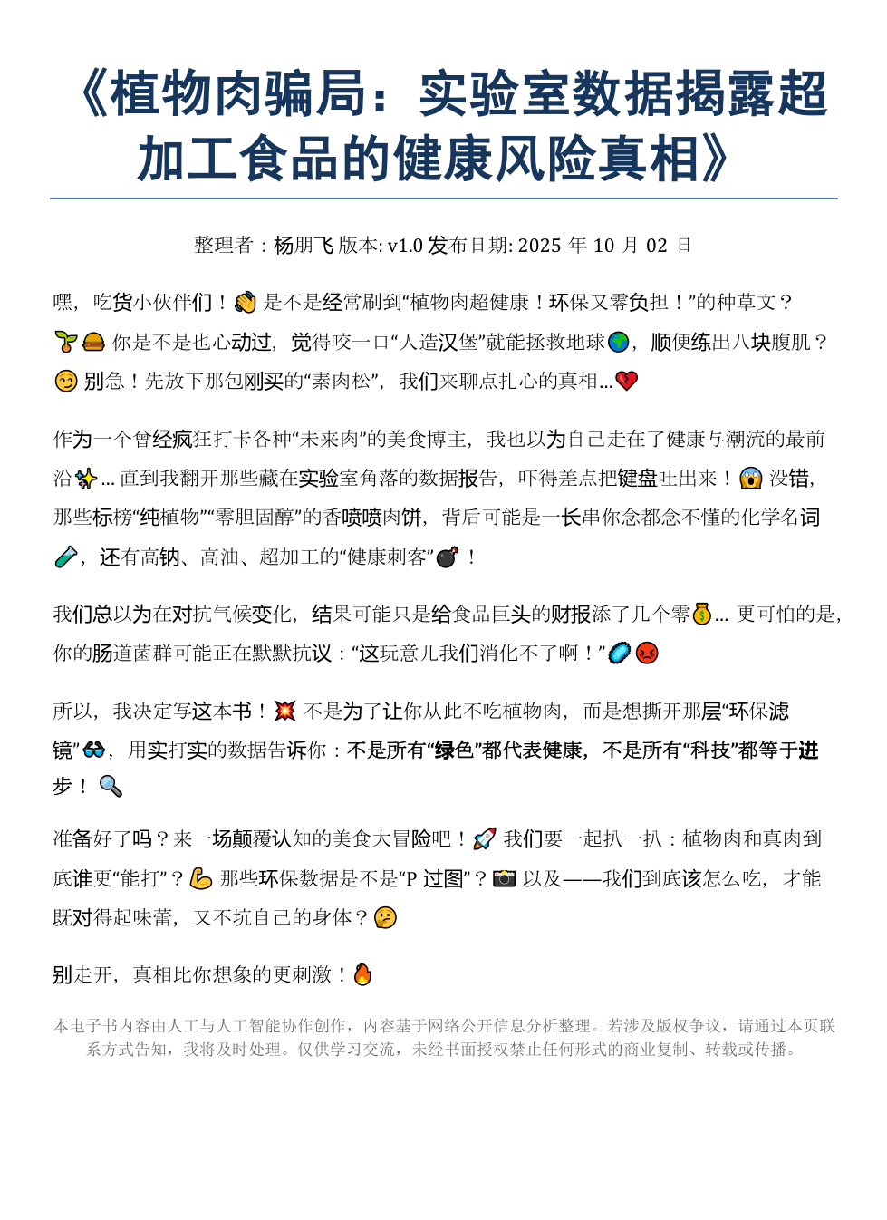 嘿,吃货小伙伴们!👋 是不是经常刷到“植物肉超健康!环保又零负担!”的种草文?🌱🍔 你是不是也心动过,觉得咬一口“人造汉堡”就能拯救地球🌍,顺便练出八块腹肌?😏 别急!先放下那包刚买的“素肉松”,我们来聊点扎心的真相…💔作为一个曾经疯狂打卡各种“未来肉”的美食博主,我也以为自己走在了健康与潮流的最前沿✨… 直到我翻开那些藏在实验室角落的数据报告,吓得差点把键盘吐出来!😱 没错,那些标榜“纯植物”“零胆固醇”的香喷喷肉饼,背后可能是一长串你念都念不懂的化学名词🧪,还有高钠、高油、超加工的“健康刺客”💣!我们总以为在对抗气候变化,结果可能只是给食品巨头的财报添了几个零💰… 更可怕的是,你的肠道菌群可能正在默默抗议:“这玩意儿我们消化不了啊!”🦠😡所以,我决定写这本书!💥 不是为了让你从此不吃植物肉,而是想撕开那层“环保滤镜”👓,用实打实的数据告诉你:不是所有“绿色”都代表健康,不是所有“科技”都等于进步! 🔍准备好了吗?来一场颠覆认知的美食大冒险吧!🚀 我们要一起扒一扒:植物肉和真肉到底谁更“能打”?💪 那些环保数据是不是“P过图”?📸 以及——我们到底该怎么吃,才能既对得起味蕾,又不坑自己的身体?🤔别走开,真相比你想象的更刺激!🔥