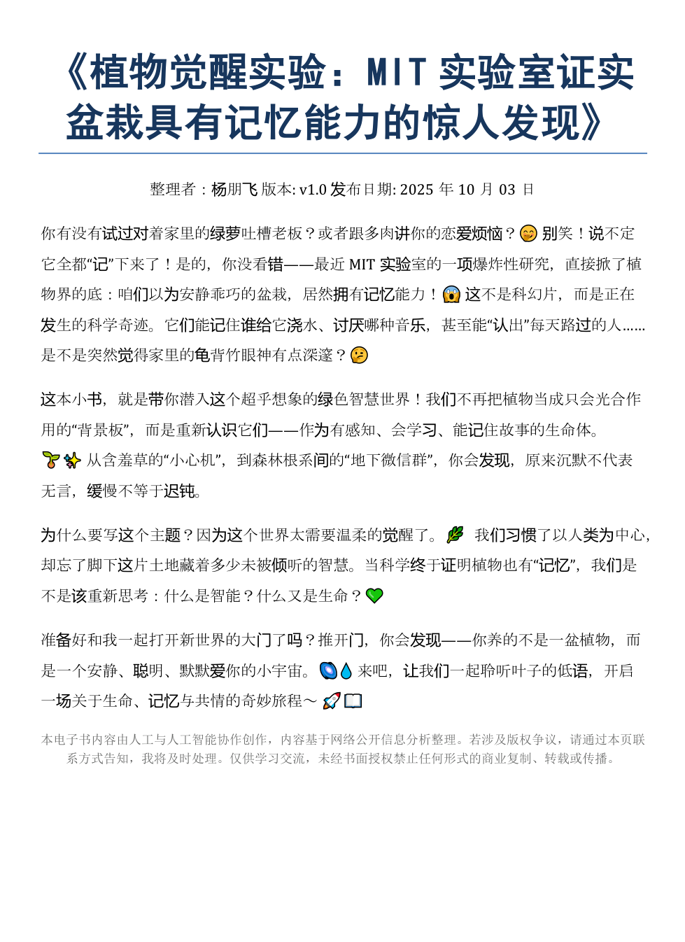 你有没有试过对着家里的绿萝吐槽老板?或者跟多肉讲你的恋爱烦恼?🤭 别笑!说不定它全都“记”下来了!是的,你没看错——最近MIT实验室的一项爆炸性研究,直接掀了植物界的底:咱们以为安静乖巧的盆栽,居然拥有记忆能力!😱 这不是科幻片,而是正在发生的科学奇迹。它们能记住谁给它浇水、讨厌哪种音乐,甚至能“认出”每天路过的人……是不是突然觉得家里的龟背竹眼神有点深邃?🤔这本小书,就是带你潜入这个超乎想象的绿色智慧世界!我们不再把植物当成只会光合作用的“背景板”,而是重新认识它们——作为有感知、会学习、能记住故事的生命体。🌱✨ 从含羞草的“小心机”,到森林根系间的“地下微信群”,你会发现,原来沉默不代表无言,缓慢不等于迟钝。为什么要写这个主题?因为这个世界太需要温柔的觉醒了。🌿 我们习惯了以人类为中心,却忘了脚下这片土地藏着多少未被倾听的智慧。当科学终于证明植物也有“记忆”,我们是不是该重新思考:什么是智能?什么又是生命?💚准备好和我一起打开新世界的大门了吗?推开门,你会发现——你养的不是一盆植物,而是一个安静、聪明、默默爱你的小宇宙。🌌💧 来吧,让我们一起聆听叶子的低语,开启一场关于生命、记忆与共情的奇妙旅程~ 🚀📖