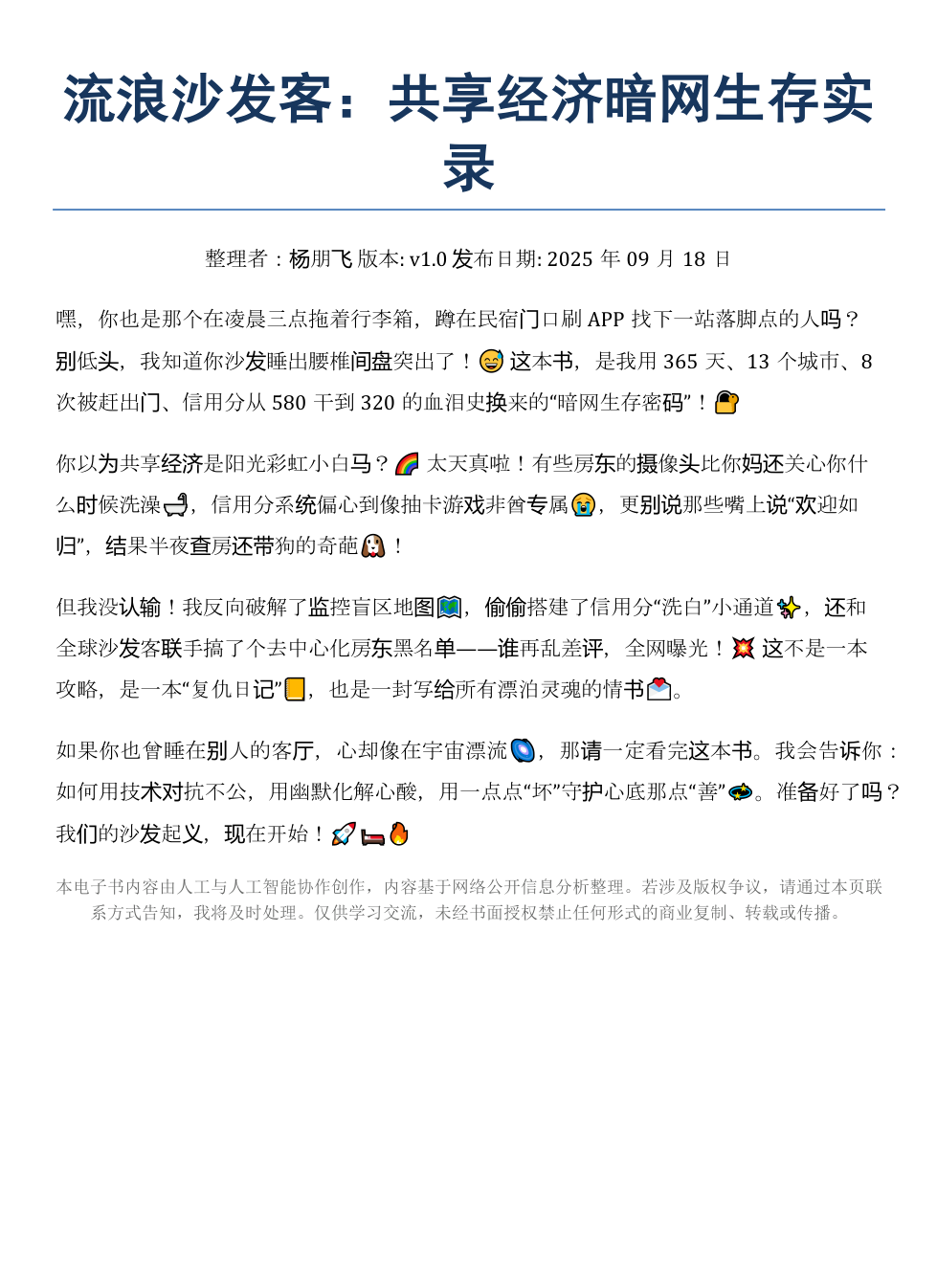 嘿,你也是那个在凌晨三点拖着行李箱,蹲在民宿门口刷APP找下一站落脚点的人吗?别低头,我知道你沙发睡出腰椎间盘突出了!😅 这本书,是我用365天、13个城市、8次被赶出门、信用分从580干到320的血泪史换来的“暗网生存密码”!🔐