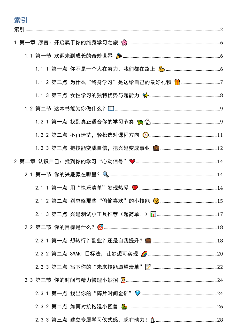 嘿,亲爱的你~是不是总在深夜刷着别人的生活:有人斜挎电脑谈笑风生做自由设计师 🎨,有人流利切换中英法三语环游世界 🌍,还有人副业收入比工资还高 💸……然后默默合上手机,心想:“我也想,但我该从哪开始呢?” 别急,你不是不够好,只是还没找到属于你的“成长密码”🔐!这本小书,就是为你量身定制的“技能升级攻略”🎮!我们不卷,不贩卖焦虑,只聊温暖又实用的干货 💖。为什么特别为女性写?因为咱们天生有超强的共情力、审美力和韧性 💪,只是常常忘了给自己一个机会去发光 ✨。在这里,没有“必须成功”的压力,只有“慢慢来也没关系”的拥抱 🤗。我们会一起探索:如何用碎片时间学一门语言,让追剧都变成学习 🍿;怎么零基础玩转设计,朋友圈配图秒变高级感 📸;还有那些让老板眼前一亮的职场神技能,比如Excel魔法、演讲气场全开……🧙♀️更棒的是,我会推荐超适合女生的在线平台,像Canva、多邻国、Coursera……全是亲测好用、不踩坑的宝藏!💎 还有怎么制定专属学习计划,避开“三分钟热度”怪圈🌀,找到学习搭子一起打怪升级~别再等“准备好”了,亲爱的,现在就是最好的开始 🌱。翻开这一页,让我们一起,把“我想”变成“我做到了”!💃 准备好,变身闪闪发光的自己了吗?GO GO GO!🚀