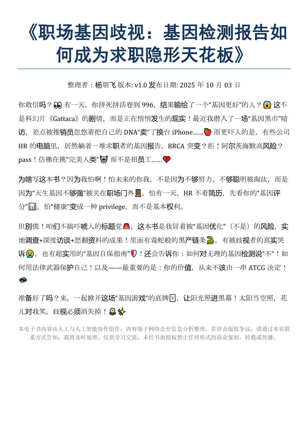 为啥写这本书?因为我怕啊!怕未来的你我,不是因为不够努力、不够聪明被淘汰,而是因为“天生基因不够强”被关在职场门外🚪。怕有一天,HR不看简历,先看你的“基因评分”📊。怕“健康”变成一种 privilege,而不是基本权利。