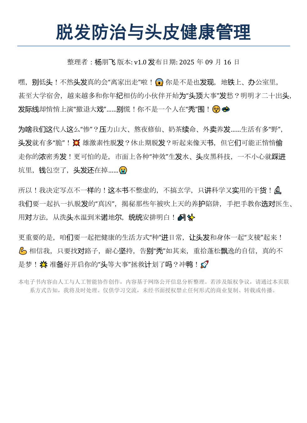 所以!我决定写点不一样的!这本书不整虚的,不搞玄学,只讲科学又实用的干货!🔬 我们要一起扒一扒脱发的“真凶”,揭秘那些年被吹上天的养护陷阱,手把手教你选对医生、用对方法,从洗头水温到米诺地尔,统统安排明白!🚿✨
