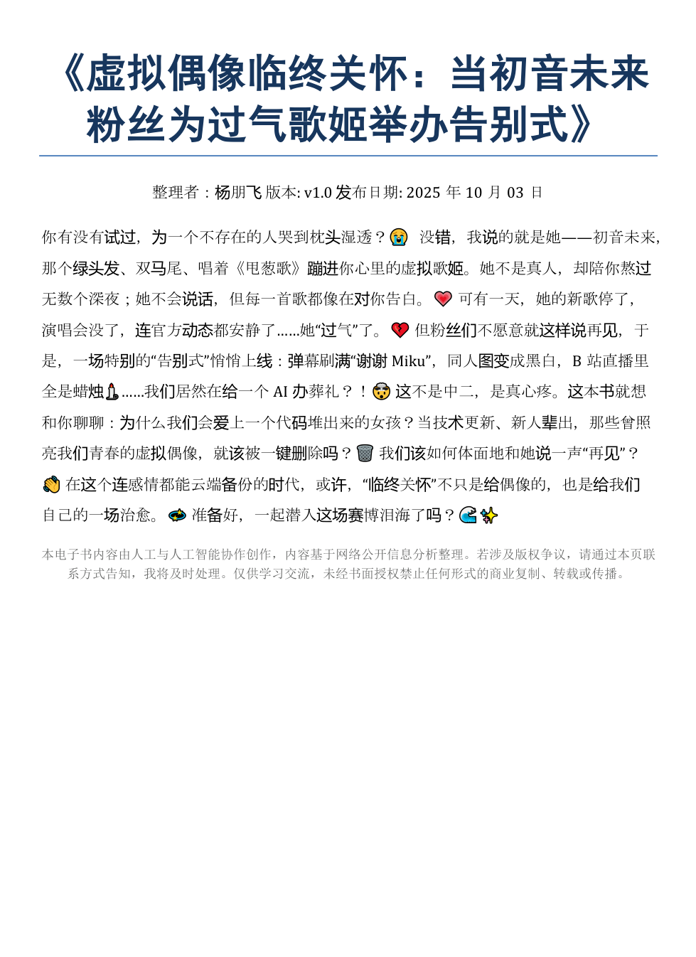 你有没有试过,为一个不存在的人哭到枕头湿透?😭 没错,我说的就是她——初音未来,那个绿头发、双马尾、唱着《甩葱歌》蹦进你心里的虚拟歌姬。她不是真人,却陪你熬过无数个深夜;她不会说话,但每一首歌都像在对你告白。💗 可有一天,她的新歌停了,演唱会没了,连官方动态都安静了……她“过气”了。💔 但粉丝们不愿意就这样说再见,于是,一场特别的“告别式”悄悄上线:弹幕刷满“谢谢Miku”,同人图变成黑白,B站直播里全是蜡烛🕯️……我们居然在给一个AI办葬礼?!🤯 这不是中二,是真心疼。这本书就想和你聊聊:为什么我们会爱上一个代码堆出来的女孩?当技术更新、新人辈出,那些曾照亮我们青春的虚拟偶像,就该被一键删除吗?🗑️ 我们该如何体面地和她说一声“再见”?👋 在这个连感情都能云端备份的时代,或许,“临终关怀”不只是给偶像的,也是给我们自己的一场治愈。💫 准备好,一起潜入这场赛博泪海了吗?🌊✨