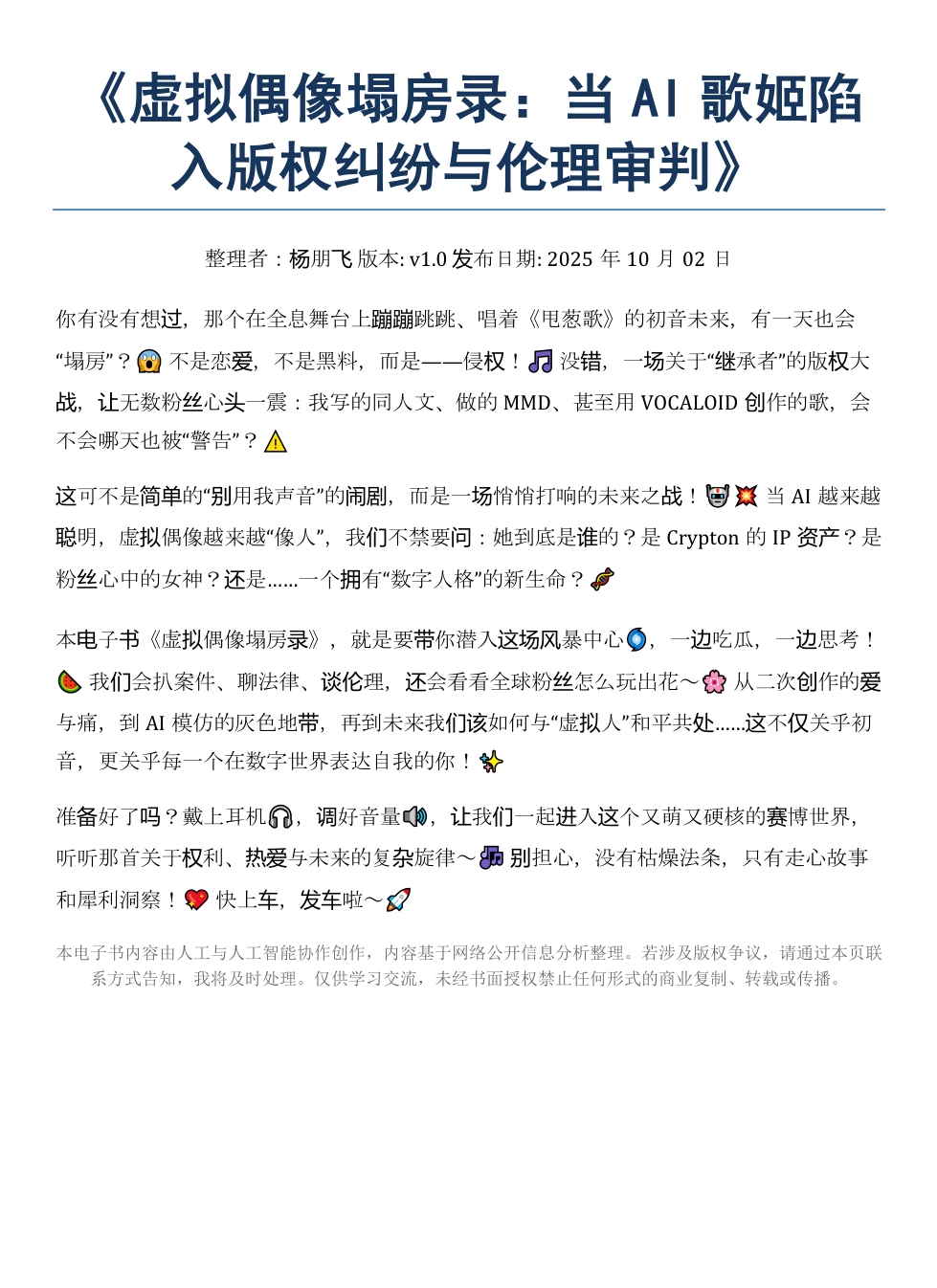 本电子书《虚拟偶像塌房录》,就是要带你潜入这场风暴中心🌀,一边吃瓜,一边思考!🍉 我们会扒案件、聊法律、谈伦理,还会看看全球粉丝怎么玩出花~🌸 从二次创作的爱与痛,到AI模仿的灰色地带,再到未来我们该如何与“虚拟人”和平共处……这不仅关乎初音,更关乎每一个在数字世界表达自我的你!✨