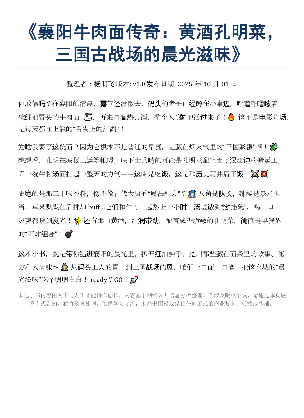 这本小书,就是带你钻进襄阳的晨光里,扒开红油辣子,挖出那些藏在面条里的故事、秘方和人情味~ 🕵️♀️ 从码头工人的胃,到三国战场的风,咱们一口面一口酒,把这座城的“晨光滋味”吃个明明白白! ready?GO!🚀