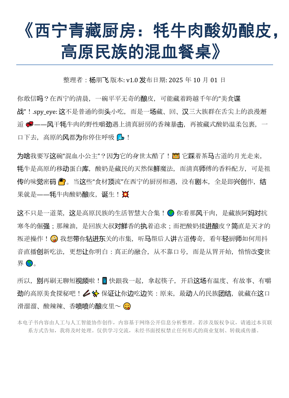 《西宁青藏厨房:牦牛肉酸奶酿皮的高原混血餐桌》AI智慧电子书