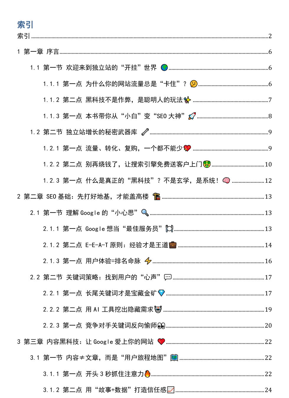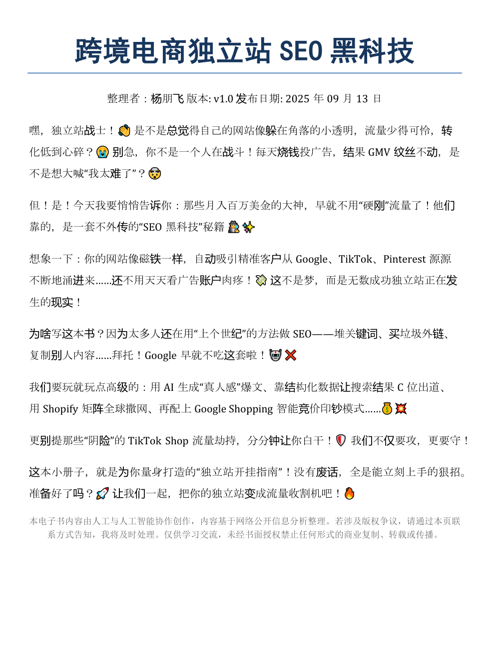 嘿,独立站战士!👋 是不是总觉得自己的网站像躲在角落的小透明,流量少得可怜,转化低到心碎?😭 别急,你不是一个人在战斗!每天烧钱投广告,结果GMV纹丝不动,是不是想大喊“我太难了”?🤯但!是!今天我要悄悄告诉你:那些月入百万美金的大神,早就不用“硬刚”流量了!他们靠的,是一套不外传的“SEO黑科技”秘籍 🕵️♀️✨想象一下:你的网站像磁铁一样,自动吸引精准客户从Google、TikTok、Pinterest源源不断地涌进来……还不用天天看广告账户肉疼!💸 这不是梦,而是无数成功独立站正在发生的现实!为啥写这本书?因为太多人还在用“上个世纪”的方法做SEO——堆关键词、买垃圾外链、复制别人内容……拜托!Google早就不吃这套啦!🤖❌我们要玩就玩点高级的:用AI生成“真人感”爆文、靠结构化数据让搜索结果C位出道、用Shopify矩阵全球撒网、再配上Google Shopping智能竞价印钞模式……💰💥更别提那些“阴险”的TikTok Shop流量劫持,分分钟让你白干!🛡️ 我们不仅要攻,更要守!这本小册子,就是为你量身打造的“独立站开挂指南”!没有废话,全是能立刻上手的狠招。准备好了吗?🚀 让我们一起,把你的独立站变成流量收割机吧!🔥
