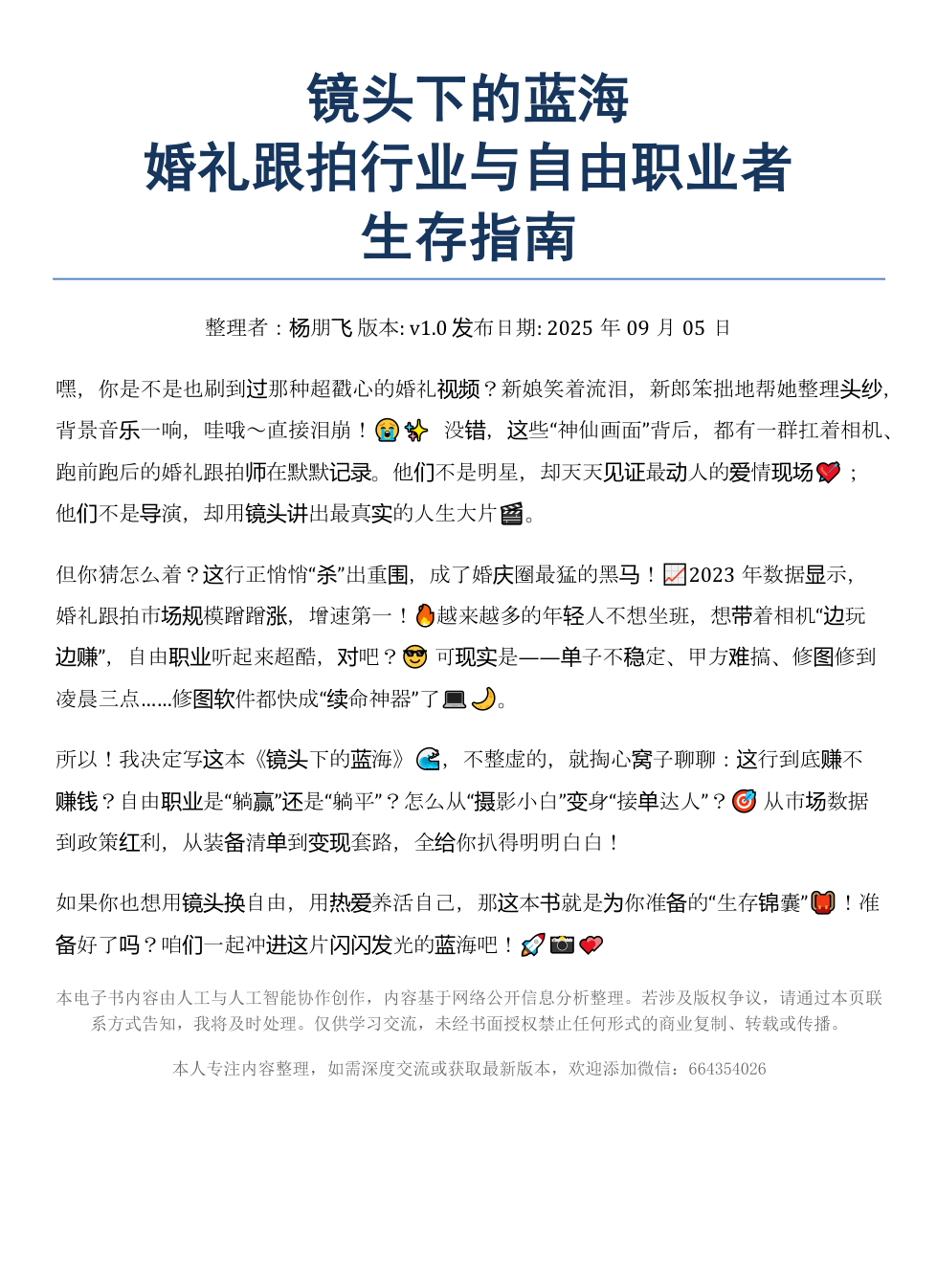 《镜头下蓝海:婚礼跟拍行业与自由职业者生存指南》AI智慧电子书