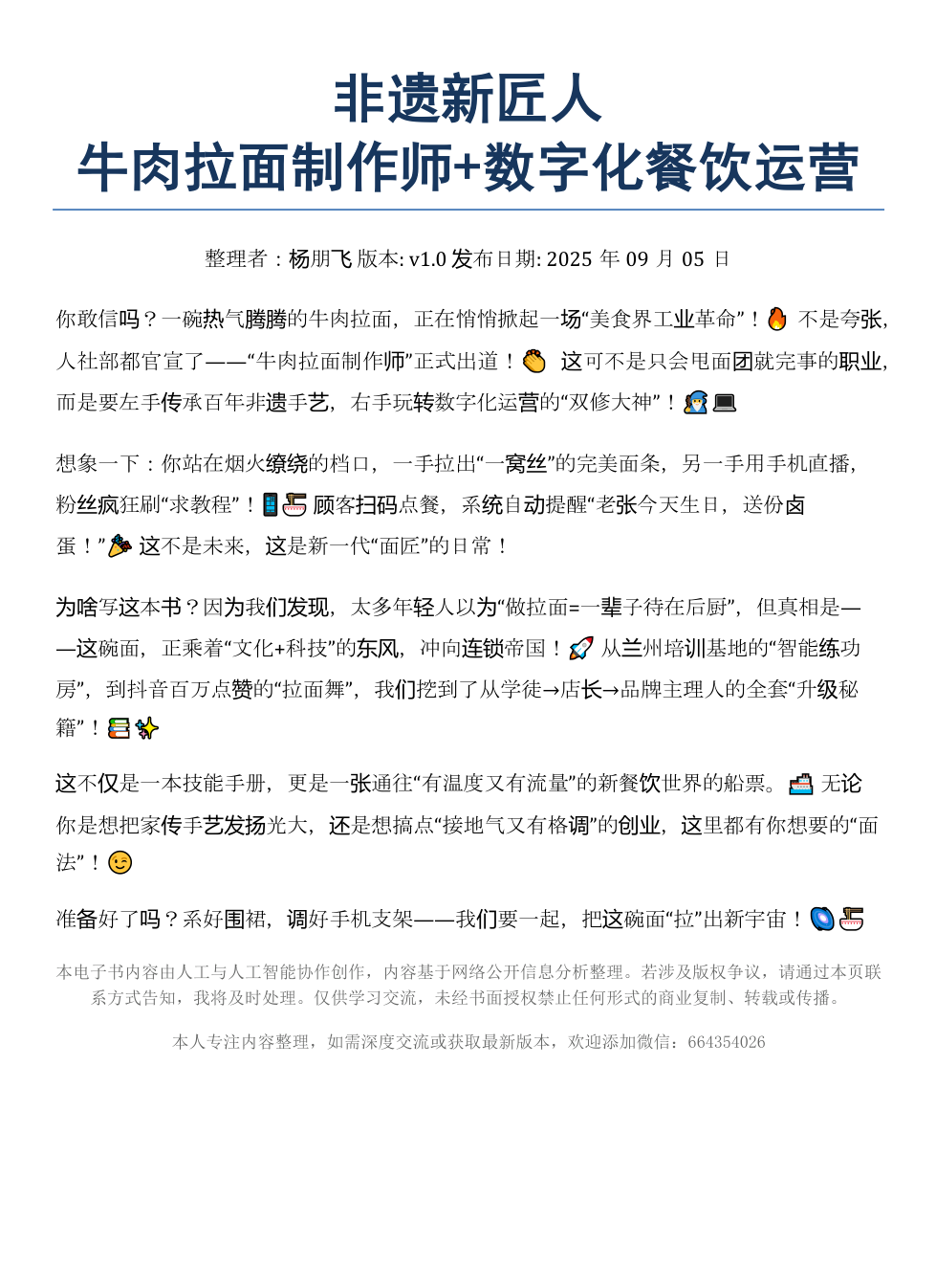 你敢信吗?一碗热气腾腾的牛肉拉面,正在悄悄掀起一场“美食界工业革命”!🔥 不是夸张,人社部都官宣了——“牛肉拉面制作师”正式出道!👏 这可不是只会甩面团就完事的职业,而是要左手传承百年非遗手艺,右手玩转数字化运营的“双修大神”!🧙‍♂️💻想象一下:你站在烟火缭绕的档口,一手拉出“一窝丝”的完美面条,另一手用手机直播,粉丝疯狂刷“求教程”!📱🍜 顾客扫码点餐,系统自动提醒“老张今天生日,送份卤蛋!”🎉 这不是未来,这是新一代“面匠”的日常!为啥写这本书?因为我们发现,太多年轻人以为“做拉面=一辈子待在后厨”,但真相是——这碗面,正乘着“文化+科技”的东风,冲向连锁帝国!🚀 从兰州培训基地的“智能练功房”,到抖音百万点赞的“拉面舞”,我们挖到了从学徒→店长→品牌主理人的全套“升级秘籍”!📚✨这不仅是一本技能手册,更是一张通往“有温度又有流量”的新餐饮世界的船票。🚢 无论你是想把家传手艺发扬光大,还是想搞点“接地气又有格调”的创业,这里都有你想要的“面法”!😉准备好了吗?系好围裙,调好手机支架——我们要一起,把这碗面“拉”出新宇宙!🌌🍜
