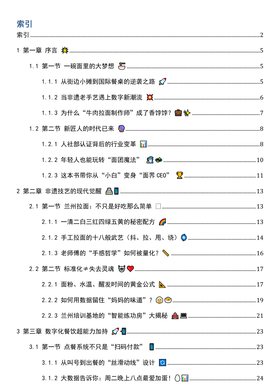 为啥写这本书?因为我们发现,太多年轻人以为“做拉面=一辈子待在后厨”,但真相是——这碗面,正乘着“文化+科技”的东风,冲向连锁帝国!🚀 从兰州培训基地的“智能练功房”,到抖音百万点赞的“拉面舞”,我们挖到了从学徒→店长→品牌主理人的全套“升级秘籍”!📚✨