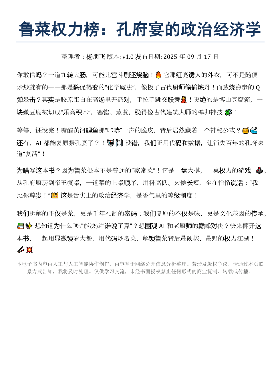 我们拆解的不仅是菜,更是千年礼制的密码;我们复原的不仅是味,更是文化基因的传承。📚✨ 想知道为什么“吃”能决定“谁说了算”?想围观AI和老厨师的巅峰对决?快来翻开这本书,一起用显微镜看大餐,用代码炒名菜,解锁鲁菜背后最硬核、最野的权力江湖!🥢💥